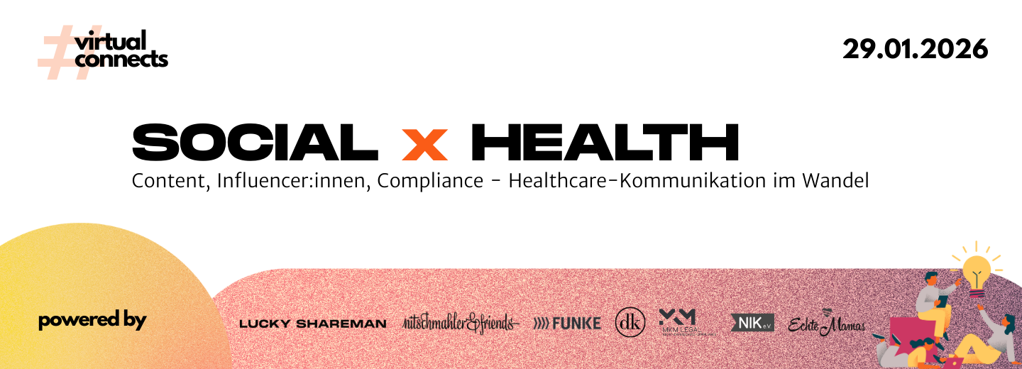 Im Rahmen von #virtualconnects | SOCIAL x HEALTH kamen am 29. Januar 2026 Expert:innen aus Kommunikation, Recht, Technologie und Patient:innenvertretung zusammen, um diese Spannungsfelder einzuordnen. In kompakten Sessions standen aktuelle Marktentwicklungen, praxisnahe Cases und die Frage im Fokus, wie zeitgemäße Healthcare-Kommunikation heute gelingen kann.